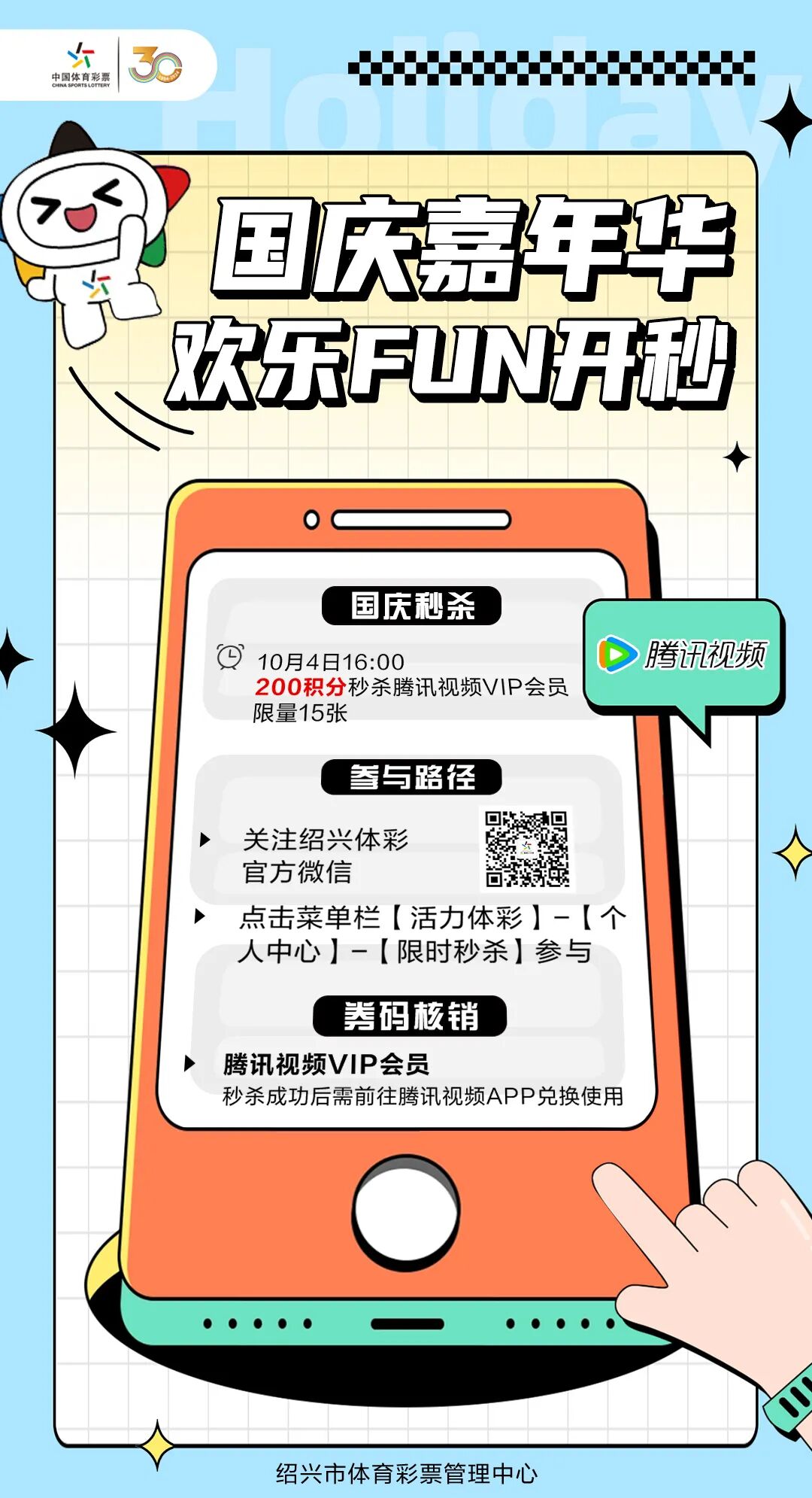 绍兴体彩个人中心于 2024年10月1日至10月4日(共4天)开展“国庆嘉年华 欢乐FUN开秒”限时秒杀活动。原定于2024年10月2日(周三)的商品上新将暂停,恢复时间为2024年10月8日。
