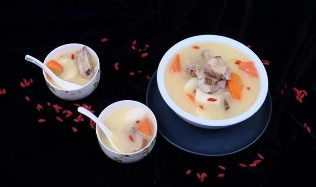 30分钟后,放入山药和胡萝卜,再煲30分钟,最后放适量盐调味,再加少许枸杞,醇香浓白的山药排骨汤就做好了。