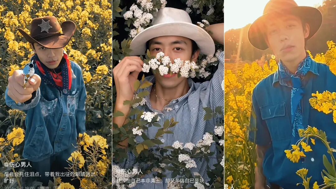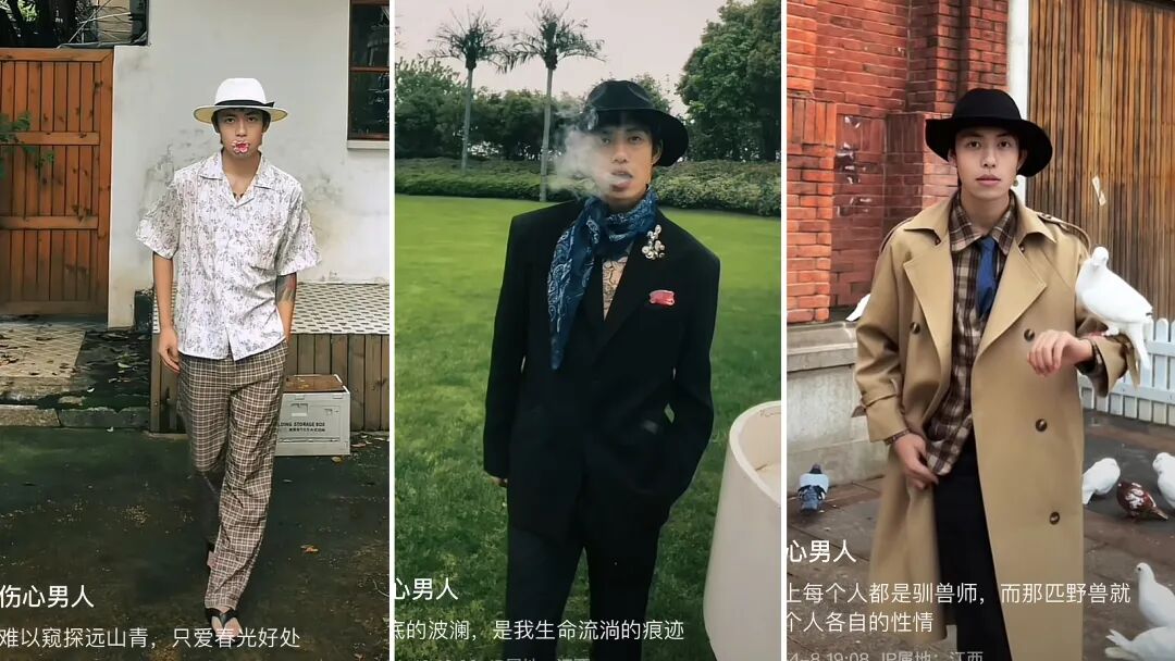 今年2月27日,@伤心男人 发布了一条具有“转折”意义的变装视频。视频中,原本站在破旧屋内的不修边幅的少年,跟随着英文BGM的节奏,紧盯着镜头一步步走近,然后转瞬之间变身为立于旷野上的西部男人,穿着考究,眼神凌厉,气质粗犷。