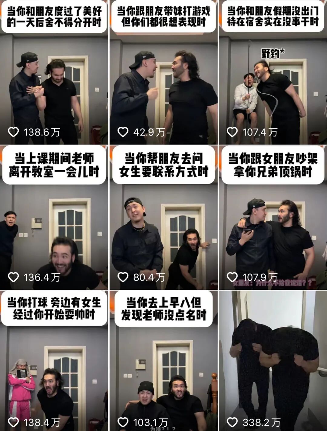 比如在其4月8日发布的作品中,兄弟二人碰面后,互相都有好消息要告知对方,当伊力率先告诉尼达自己谈恋爱之后,尼达痛心疾首发表一番兄弟宣言,表示自己“10年不打算碰恋爱,只跟你玩”,并表示对方没为自己考虑,“有点失望” ,而伊力则大受感动,表示自己现在就分手,随后,当他询问尼达的好消息究竟是什么时,尼达却从兜里掏出一个瓶盖,说自己“中了个再来一瓶”,等下换完奖,“一人一瓶去网吧”。好笑的过程和出乎意料的结尾让不少用户看得忍俊不禁,视频也最终收获了412.5W点赞。