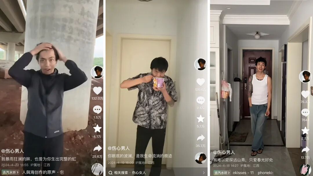 据卡思观测,早在2020年1月,他就在抖音上发布了第一条作品。前期他发布的内容基本都是用一张照片或一段简短影像,搭配氛围感BGM和一段情感文案。此时虽然已经有人从这些视频中get到了他的帅气,但也有很多人吐槽他“精神”“非主流”,这个时期@伤心男人的粉丝数量增长速度并不快,虽然也曾在2022年年底出过一条点赞近200W的爆款视频,但视频的整体数据表现参差不齐。