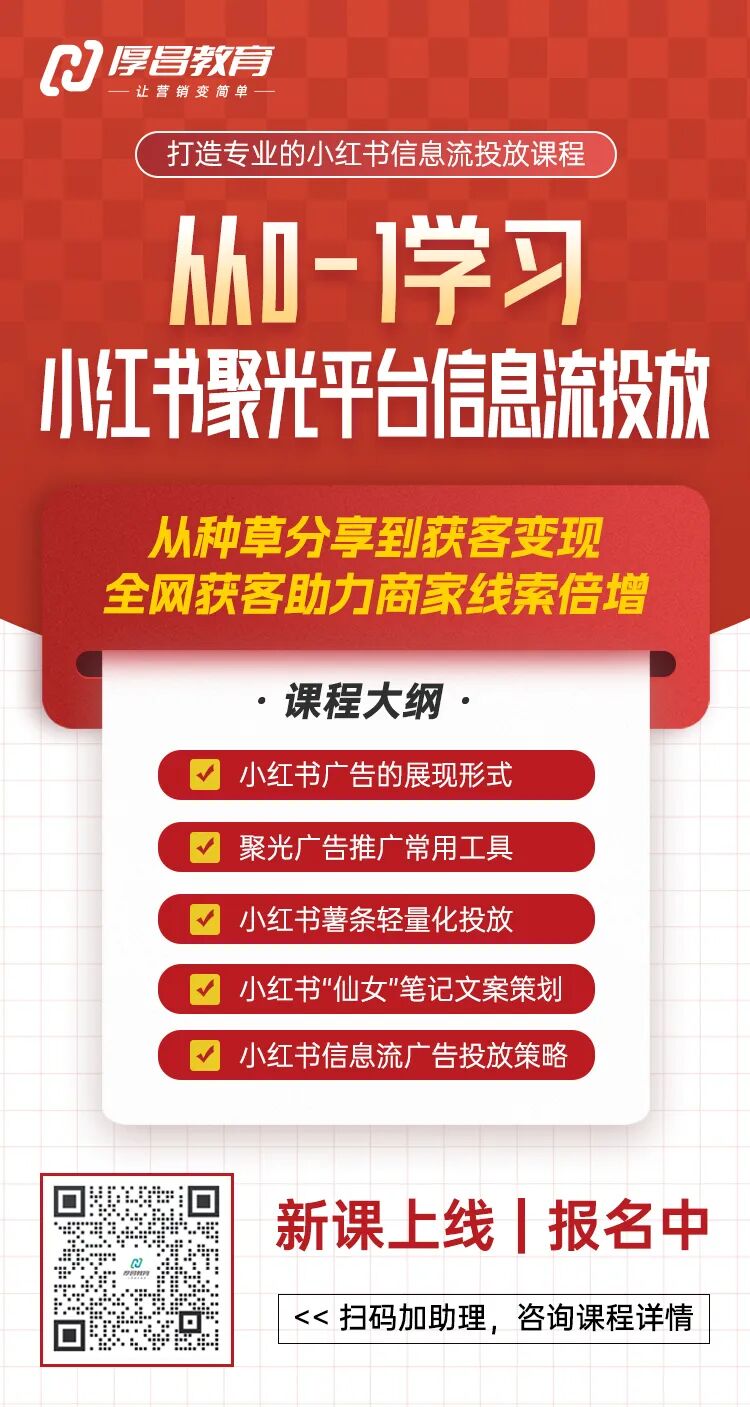 如果你是正在投放小红书渠道的优化师,想要在小红书获得线索的商家,亦或是想要转行的小白,柯楠老师针对目前小红书的平台趋势推出《从0-1学习小红书聚光平台信息流投放》课程。